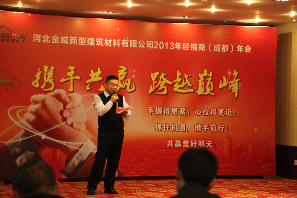 金龍笑歸隱,銀蛇喜相迎,金威以“攜手同行,跨越巔峰”為主題的 2013 年經(jīng)銷商年會于 2012年12 月 31日至2013年1月4日在中國的魅力之都-----成都順利召開??偨?jīng)理高永濤先生帶領(lǐng)著公司部分中高層領(lǐng)導(dǎo)一同歡迎來自全國各地二十多個省市的經(jīng)銷商朋友。