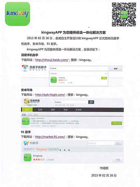 2015年02月26日,金威自主開發(fā)設(shè)計(jì)的kingwayAPP正式登陸百度手機(jī)助手、安卓市場(chǎng)、91助手。