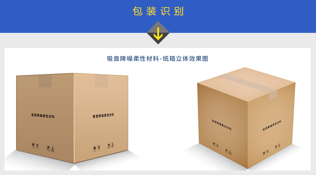 二、"金威"牌吸音降噪系列產(chǎn)品包裝為紙箱包裝,上面統(tǒng)一打印有吸音降噪柔性材料的字樣。